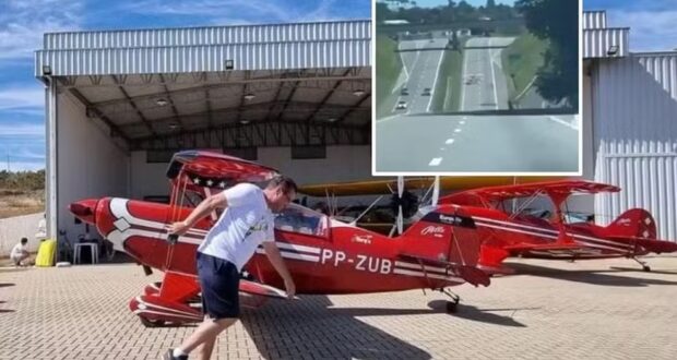 Ao tocar o solo, Censoni levou o avião para uma alça de acesso da rodovia e acabou atingindo uma placa de sinalização. “A única coisa que não deu 100% certo foi ter acertado essa placa”, disse o piloto, que não se feriu.