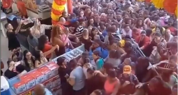 Moradores flagraram o tumulto que clientes fizeram para entrar no lugar. Um segurança controla a entrada quando as pessoas acabam pressionando e quebrando um vidro. Os moradores ainda relataram que a rua ficou bloqueada devido ao número de pessoas na fila.