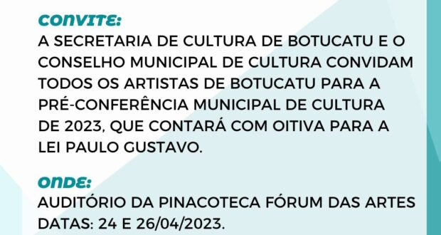 A Secretaria Municipal de Cultura e Conselho Municipal de Cultural, realizam nos dias 24 e 26 de abril, no auditório da Pinacoteca Fórum das Artes, a Pré-Conferência Municipal de Cultura de Botucatu.