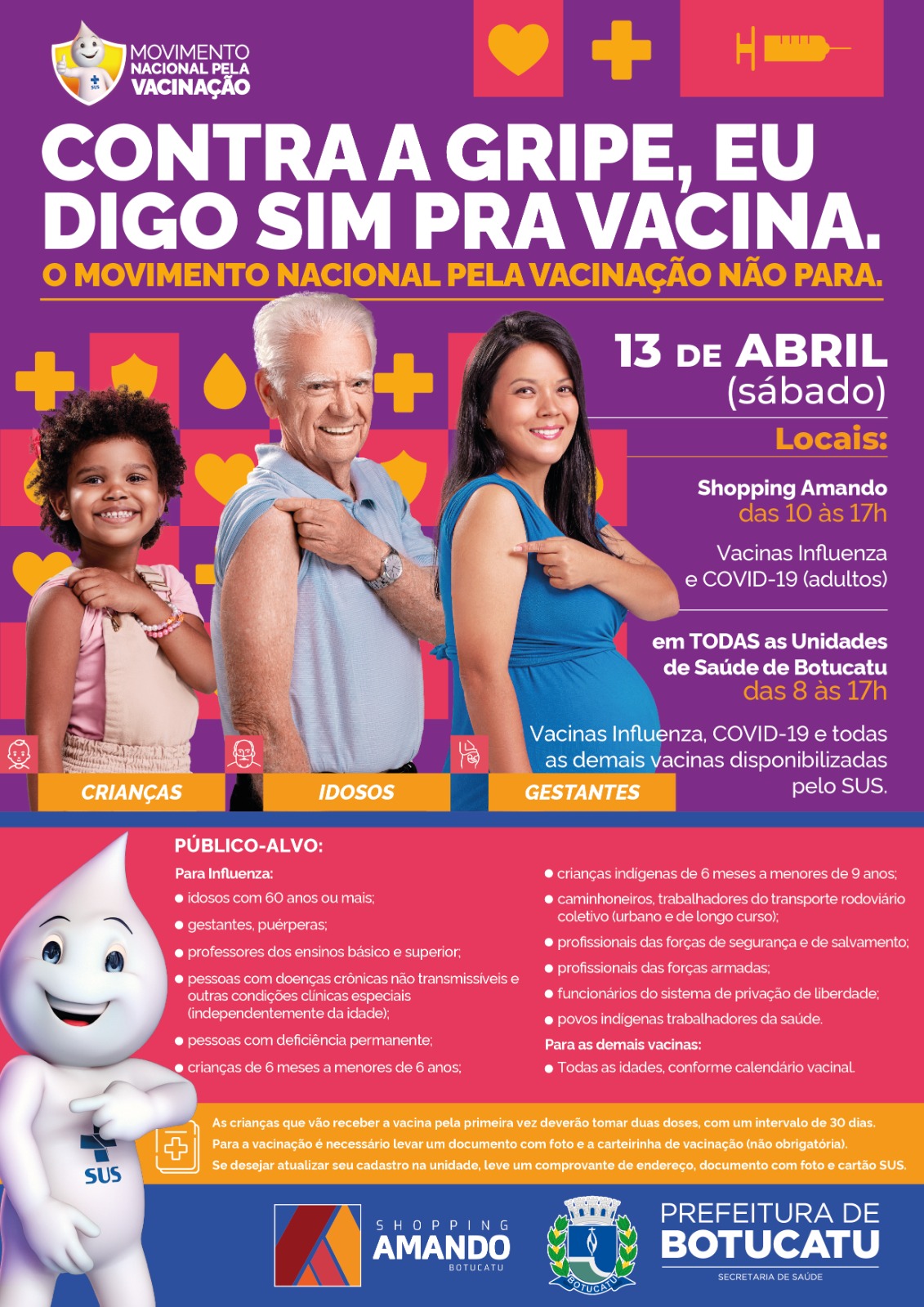 O Shopping Amando vai receber neste sábado, 13 de abril, a campanha de vacinação da Secretaria Municipal de Saúde.
