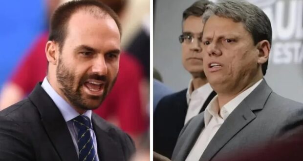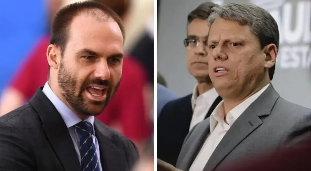 O deputado federal licenciado Eduardo Bolsonaro (PL-SP) criticou nesta terça-feira (15), em uma rede social, a postura do governador de São Paulo, Tarcísio Gomes de Freitas (Republicanos), diante do tarifaço imposto pelo presidente dos Estados Unidos, Donald Trump, aos produtos brasileiros em reação aos processos contra o ex-presidente Jair Bolsonaro na Justiça.