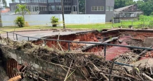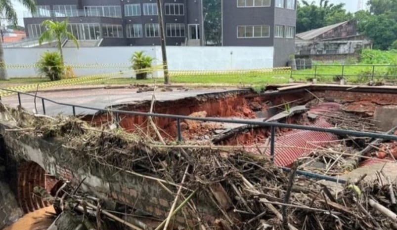 As águas levaram também o parapeito da ponte que fica na lateral do ginásio 1 da Associação Atlética Ferroviária. O local também está interditado.