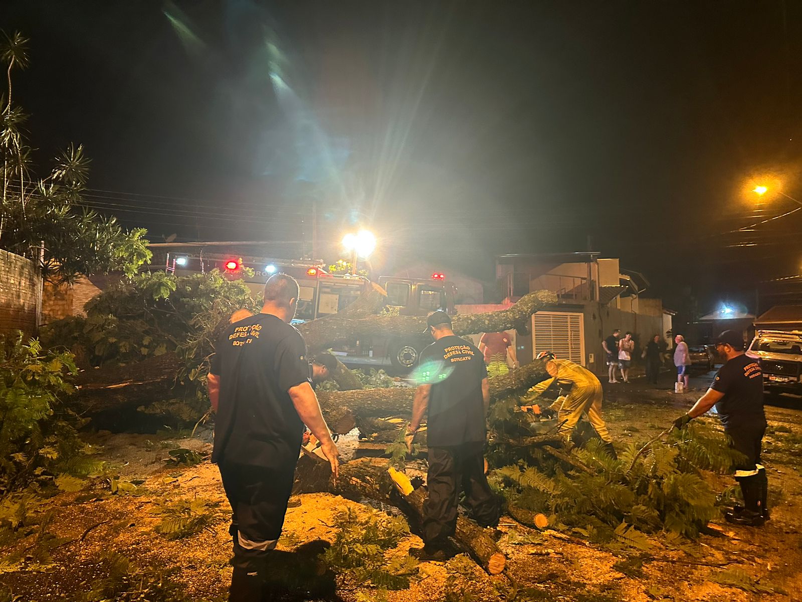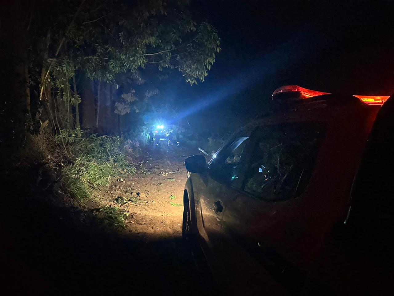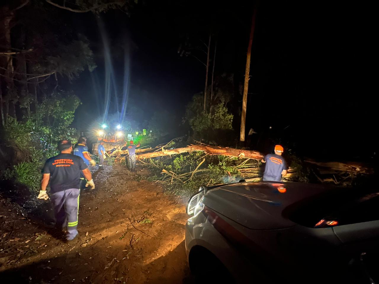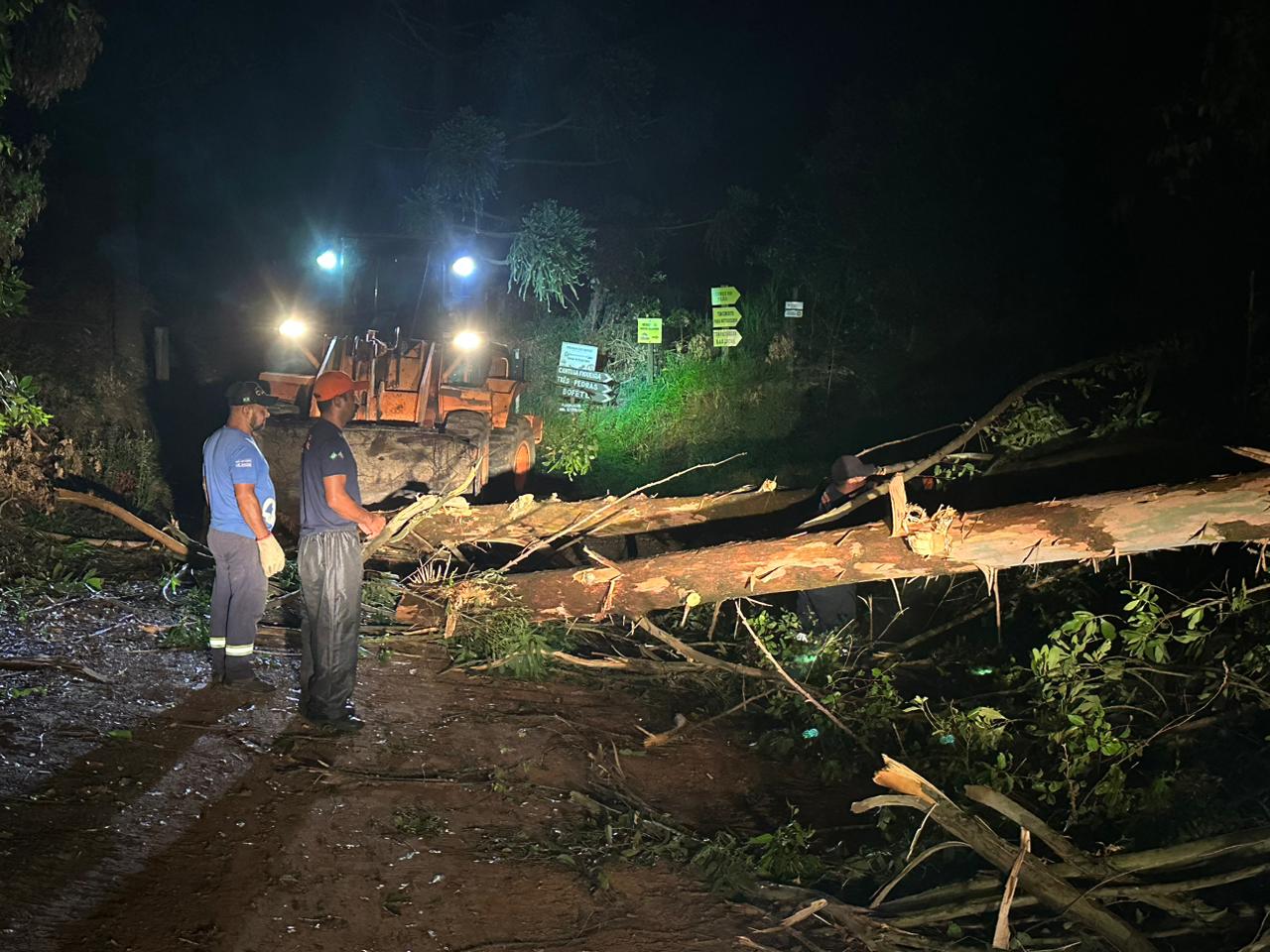 Equipe da Defesa Civil se deslocou até o local para desobstruir a estrada rural. A maior parte do eucaliptos quebrou ao meio, o que dificultou o trabalho dos agentes.