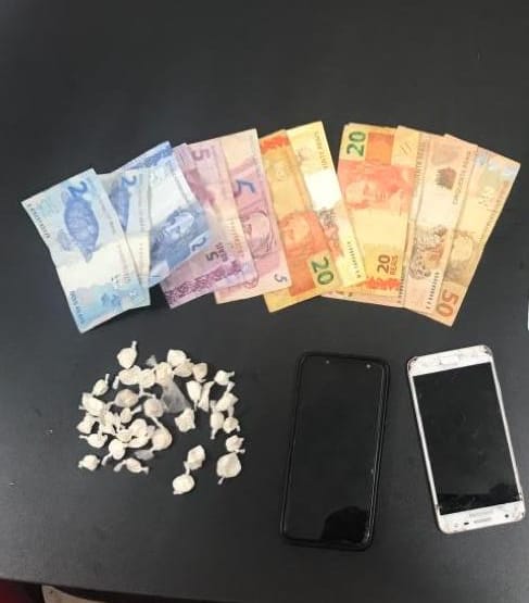 Realizada a abordagem e com os indivíduos nada de ilícito foi encontrado, em busca ao veículo foi localizado certa quantia em dinheiro e 34 porções de cocaína no porta-luvas do veiculo.