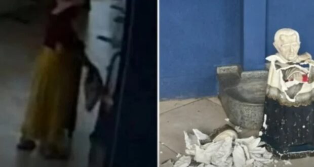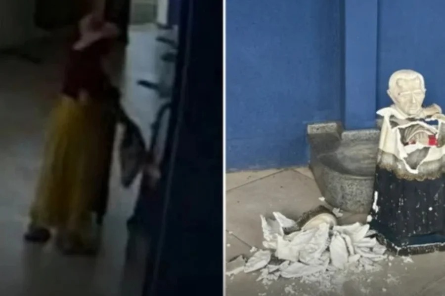 Imagens das câmeras de segurança registraram a ação. No vídeo, a turista aparece se aproximando do monumento e golpeando a escultura com a bolsa. Após a terceira batida, a peça perde o equilíbrio, cai e se quebra em vários fragmentos. Um guarda municipal que atuava no terminal localizou a suspeita e efetuou a prisão em flagrante.