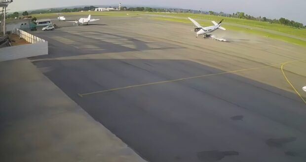 Imagens registradas por câmeras de segurança mostram o momento em que um avião bimotor, modelo king-air, bate com a asa na pista, derrapa e explode em um aeroporto particular de uma empresa do agronegócio, em Cuiabá, na tarde desta quarta-feira (4).