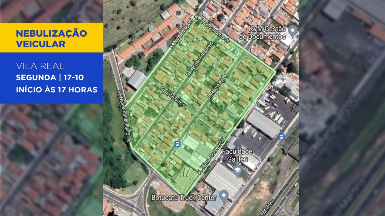 A equipe da Vigilância Ambiental em Saúde iniciará a nebulização a partir das 17 horas, com término previsto às 19 horas. Em caso de chuva ou ventos acima de 10km/h a ação será reagendada.