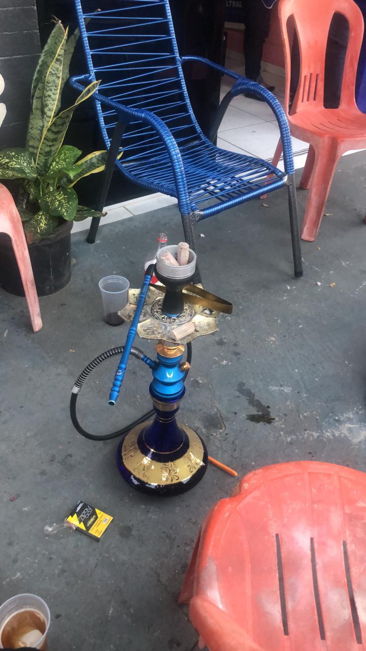 No local foi verificado que haviam mais de oito pessoas fazendo uso compartilhado de um único Narguilé, bebida alcoólica e estavam todos sem mascara.