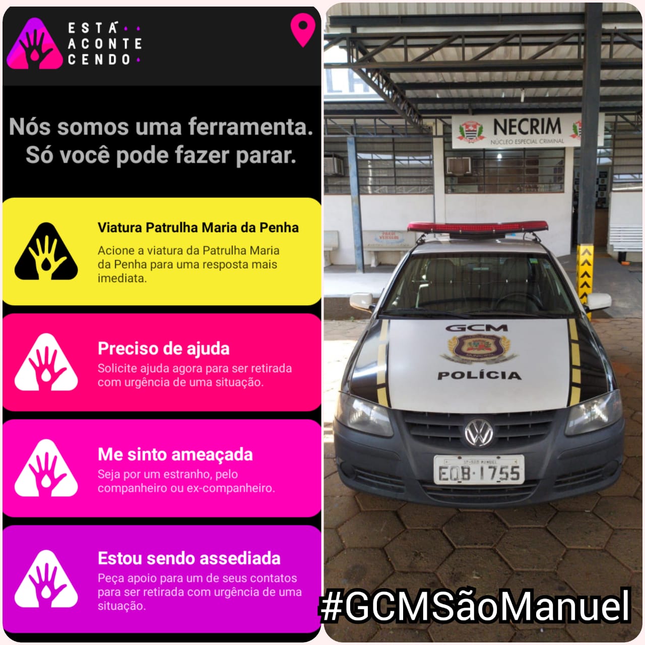 A vitima que há tempos vinha sofrendo agressões e ameaças vinha sendo acompanhada pela Patrulha Maria da Penha da GCM São Manuel, possuía medidas protetivas e também utilizava o aplicativo “ Está Acontecendo (Maria da Penha)” em seu celular para acionamento da Guarda Civil Municipal.